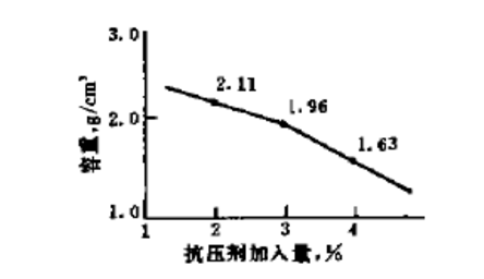 圖4為抗壓劑加入量與容重的關系曲線。從圖4可以看出,抗壓劑加入量的變化對輕質部分容重的影響比體積穩定劑明顯,抗壓劑加入量的增加可使輕質部分的容重明顯降低。