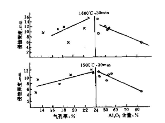 圖1 1500℃、1600℃時保溫30min的氣孔率、Al2O3含量與侵蝕深度的關系