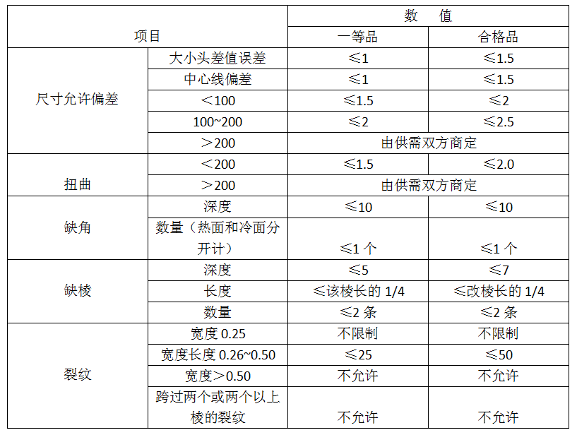 表2 水泥窯用磷酸鹽結合高鋁質磚的尺寸偏差及外觀