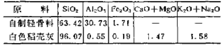 主要原料為自制輕骨料和白色稻殼灰。化學(xué)成分見表2,輕骨料的容量為1.61g/cm3、顯氣孔率為42%,耐壓強(qiáng)度27MPa。