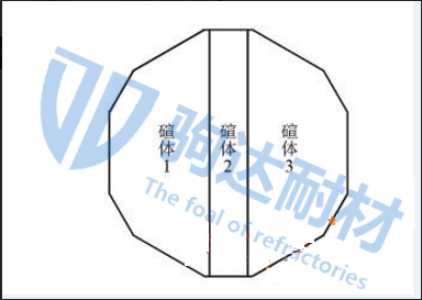 隨著近年來(lái)電熔窯逐漸向大熔化面積(熔化面積大于20m2)發(fā)展方向,對(duì)于吊碹的設(shè)計(jì)也提出了新的挑戰(zhàn)。吊碹面積加大意味著重量增加,為了保證吊碹的可重復(fù)利用因此獨(dú)創(chuàng)了分體吊碹結(jié)構(gòu),圖1為國(guó)內(nèi)某廠家設(shè)計(jì)的21m2電熔窯吊碹拆分示意圖,將碹體分為3部分,每部分獨(dú)立承重在裝卸時(shí)可單獨(dú)拆分吊裝。