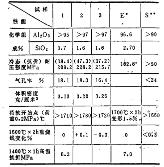 試樣配好經(jīng)混合后,用顆粒澆注法制成25×25×140(mm)的試樣和36×50(mm)的試樣。干燥(110℃×12h)后在1500℃×3h下燒成、對(duì)三種試樣的性能進(jìn)行了測(cè)定并與英國(guó)和蘇聯(lián)的同類(lèi)產(chǎn)品性能做比較,結(jié)果列于表三。