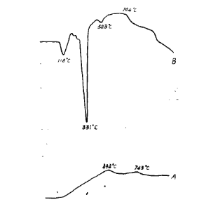 由上述數(shù)據(jù)中冷態(tài)強(qiáng)度的突變可以認(rèn)為:莫來(lái)石約在1000℃時(shí)形成,這也可以用熱力學(xué)計(jì)算加以證明,例如γ-Al2O3與無(wú)定形SiO2之間形成莫來(lái)石的△G900k已為-38.2千焦。而α-Al2O3與無(wú)定形SiO2之間形成莫來(lái)石的△G1100k則為-0.26千焦。也就是說(shuō),α和γ-Al2O3只要充分活化后滿足動(dòng)力學(xué)條件,則分別可以在827℃和327℃就能形成莫來(lái)石了。但是由圖2的1000℃×3h燒后的試樣中并不能觀察到晶態(tài)莫來(lái)石的存在,對(duì)此,我們認(rèn)為:在如此低的溫度下,雖然莫來(lái)石可以形成,但由于擴(kuò)散量很小,所以形成的初生態(tài)或非化學(xué)計(jì)算莫來(lái)石并不能長(zhǎng)大成為足以觀察到的莫來(lái)石晶體,但卻已發(fā)揮了其較大的結(jié)合強(qiáng)度,為了進(jìn)一步證實(shí)我們這一推測(cè),我們對(duì)A、B兩種復(fù)合膠結(jié)劑分別作了差熱分析、其差熱曲線如圖3所示;