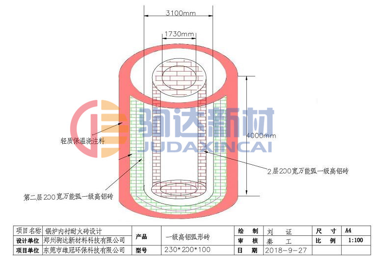我公司是專業(yè)從事耐火材料的生產(chǎn)制造與窯爐的設(shè)計(jì)安裝工作,主要生產(chǎn)耐火磚有高鋁材質(zhì)、粘土材質(zhì)、剛玉材質(zhì)、碳化硅材質(zhì)和輕質(zhì)隔熱耐火磚等耐火材料,近期我公司收到東莞雄冠環(huán)保科技有限公司,發(fā)來的30t熱解爐使用耐火材料的分布圖并希望能夠得到我公司在材料與設(shè)計(jì)安裝上的支持,收到相關(guān)資料后我公司設(shè)計(jì)安裝部門進(jìn)行了核對(duì),并繪制相關(guān)使用的萬能弧耐火磚的設(shè)計(jì)砌筑方法。雄冠環(huán)保提供的熱解爐相關(guān)資料。